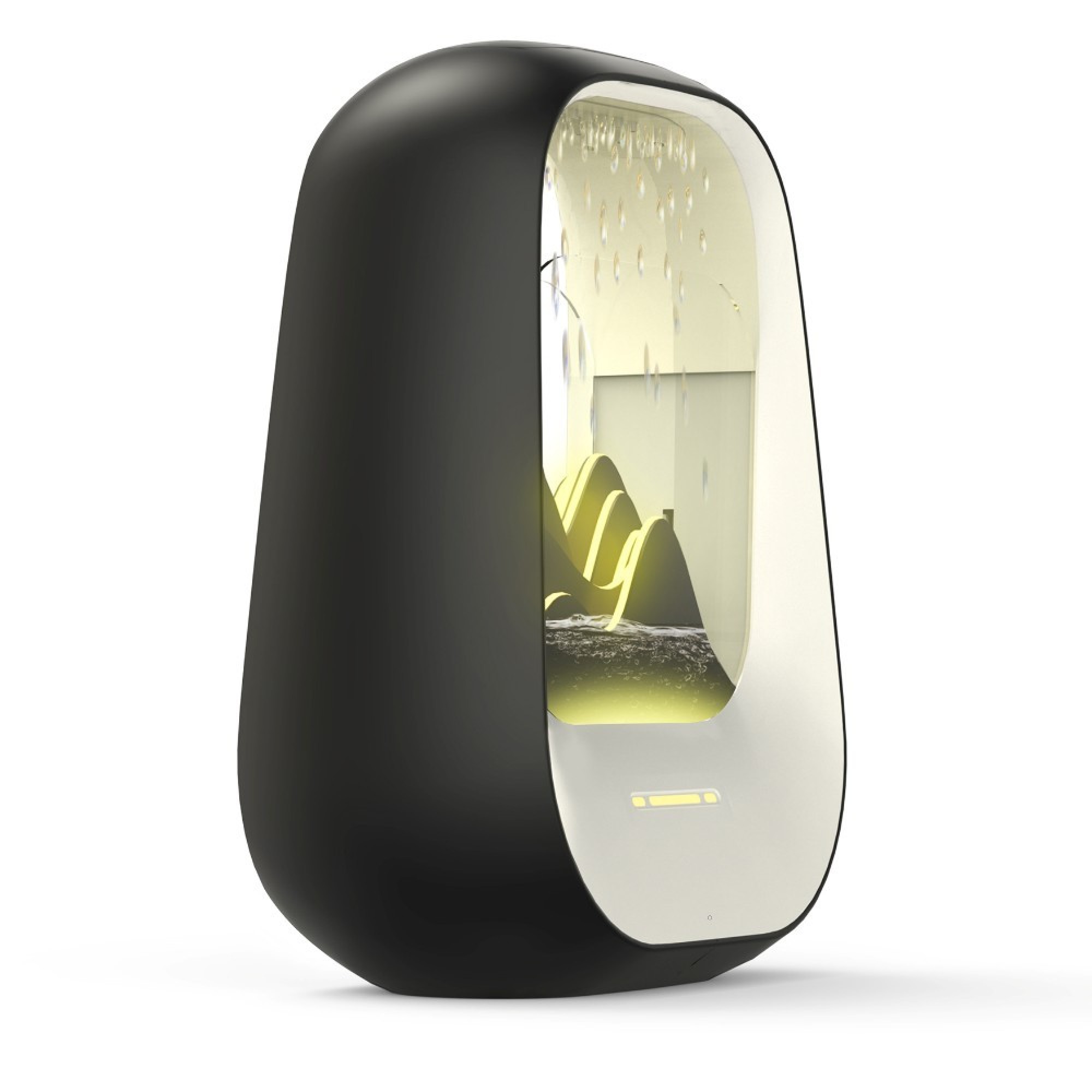 LED apšvietimas kartu su vandens lašėjimu kuria hipnotizuojantį, vizualiai malonų efektą – tarsi vizualinė meditacija, puikiai deranti su relaksacine muzika.