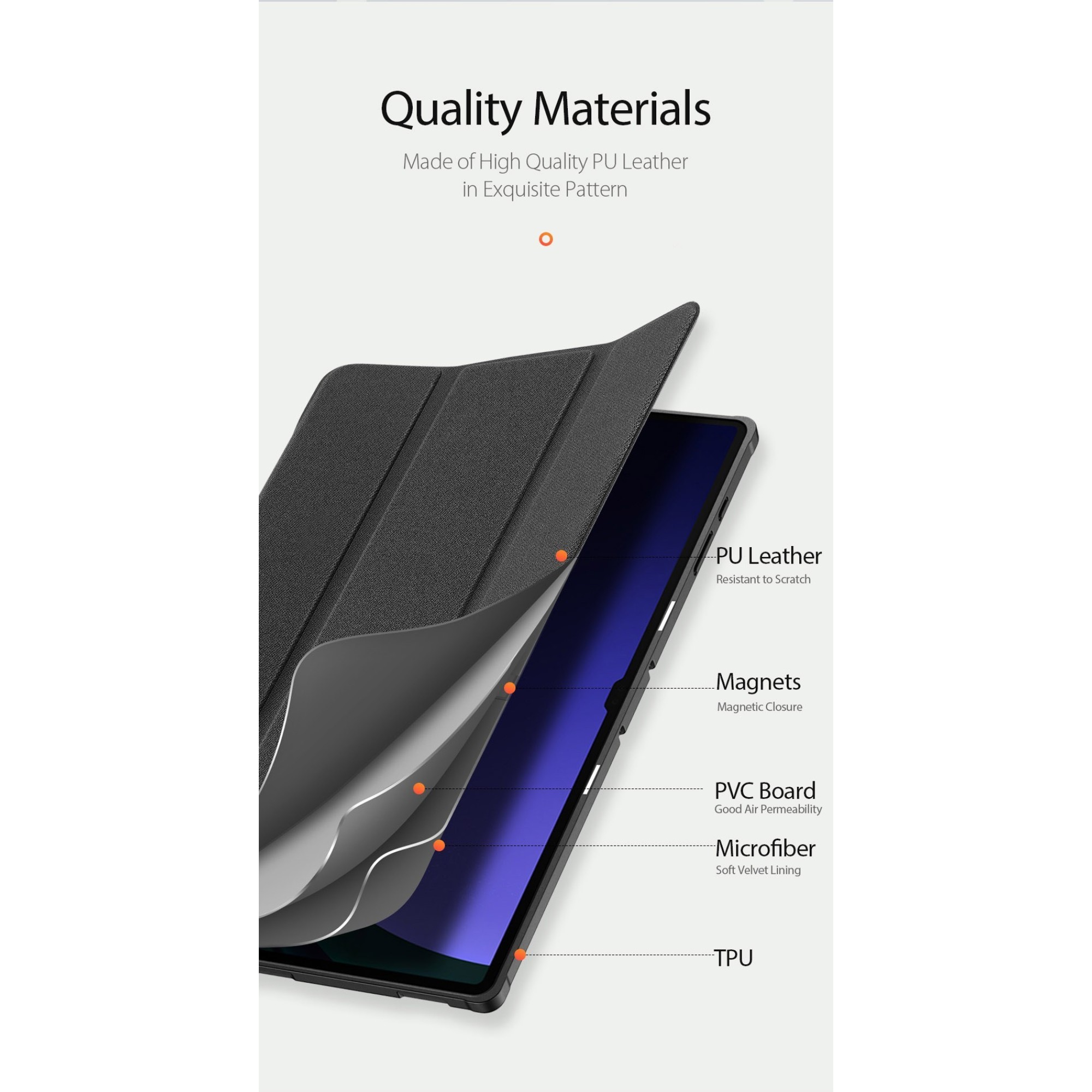 - Šis planšečių dėklas pagamintas iš TPU+PU medžiagos, kuri yra atspari smūgiams ir įbrėžimams.