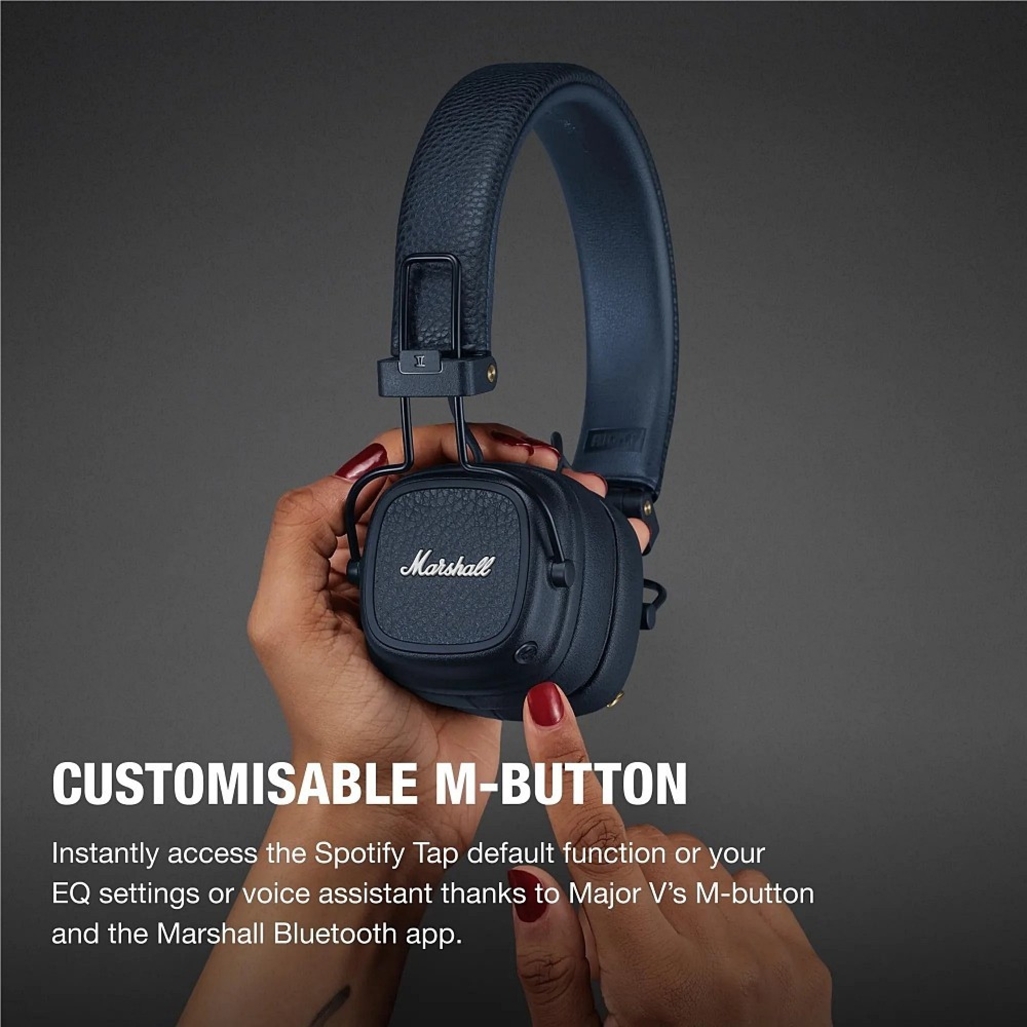 Instantly access your favourite features thanks to Major V’s M-button and the Marshall Bluetooth app. All you have to do is press on the M-script logo to open the Spotify Tap default function, your EQ settings or voice assistant.
