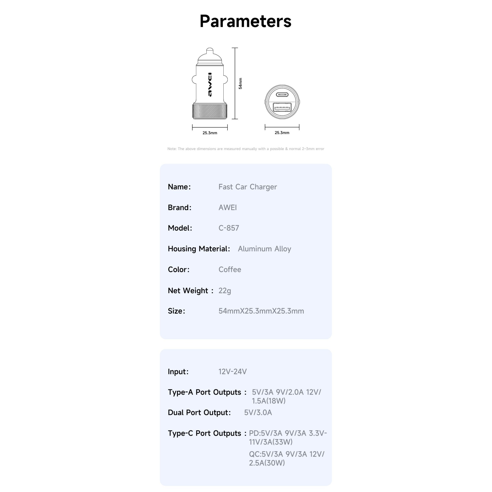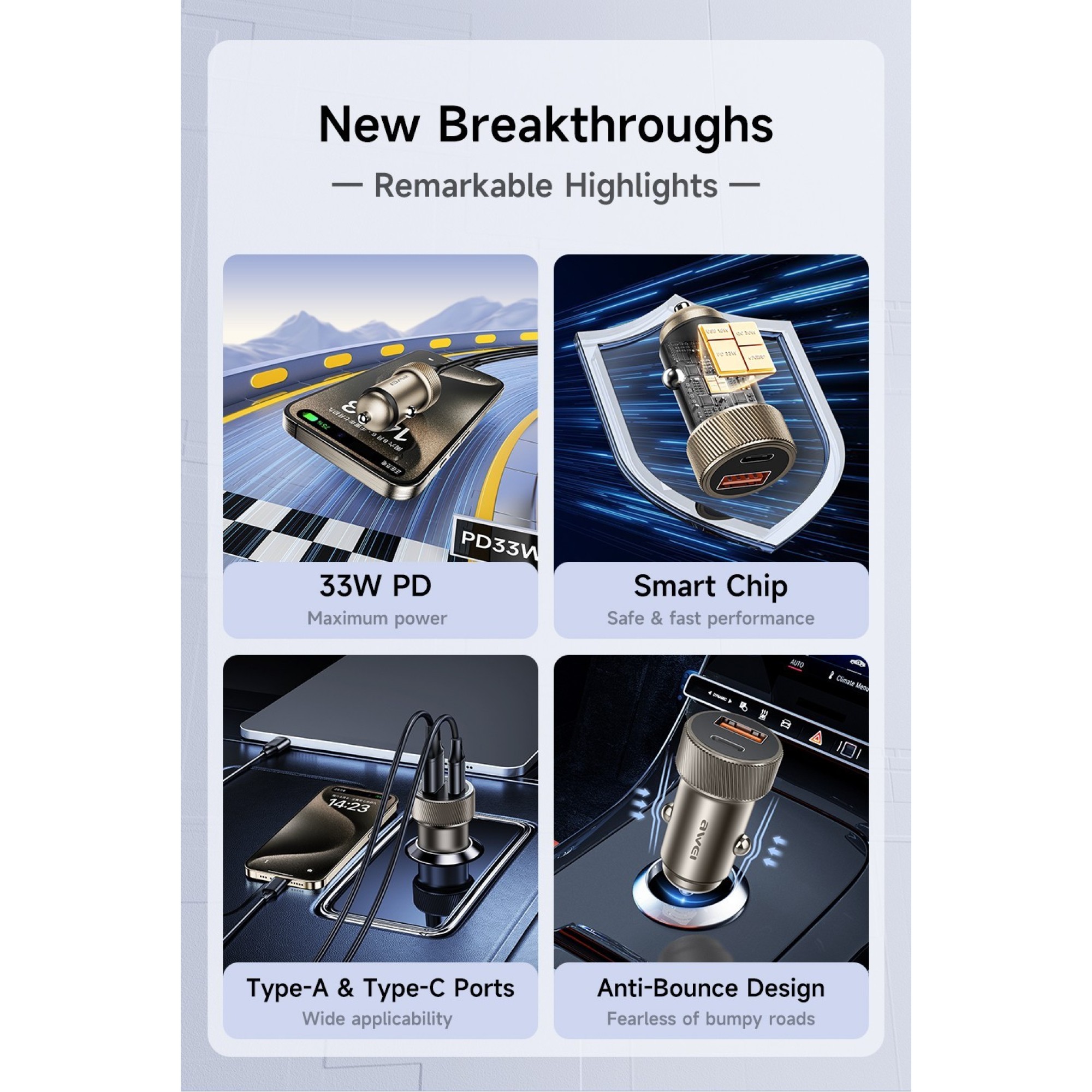 Power up efficiently on the road with the Awei C-857, a sleek and durable car charger crafted with performance and safety in mind. With intelligent dual-port fast charging, wide voltage compatibility, and robust protective features, the C-857 is the ideal charging companion for your daily drives and road trips.