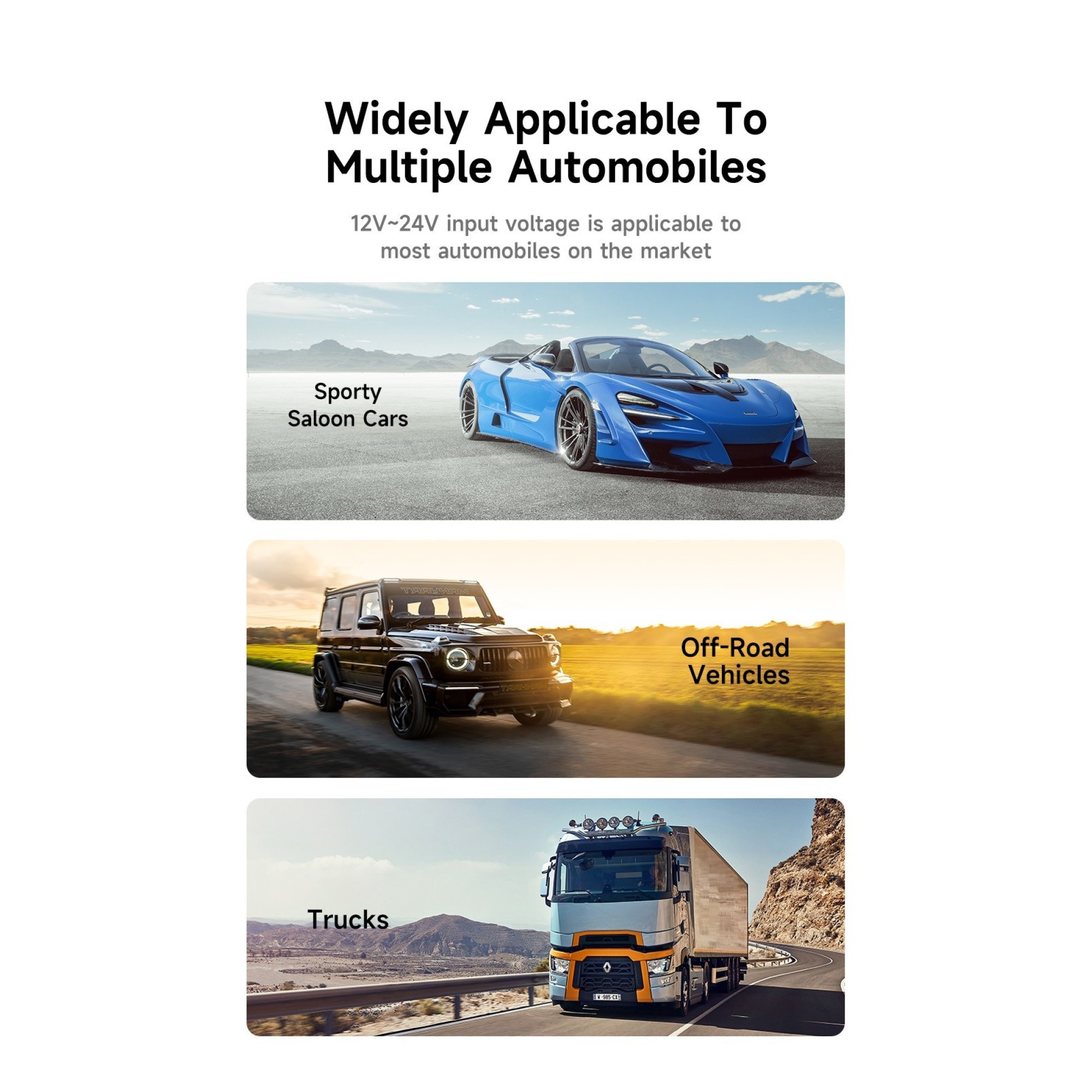 Supports 12V–24V input, making it compatible with a broad range of vehicles—from compact cars to trucks.