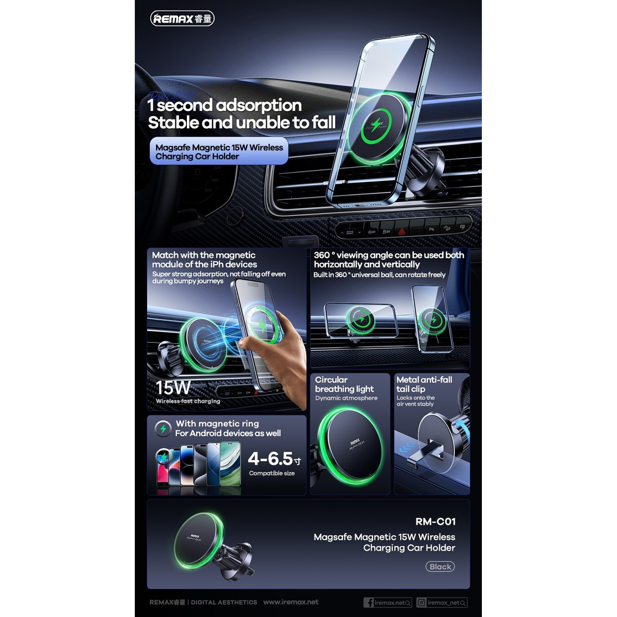 Strong Adhesion: Withstands bumps and vibrations, providing 15W wireless fast charging that starts instantly.