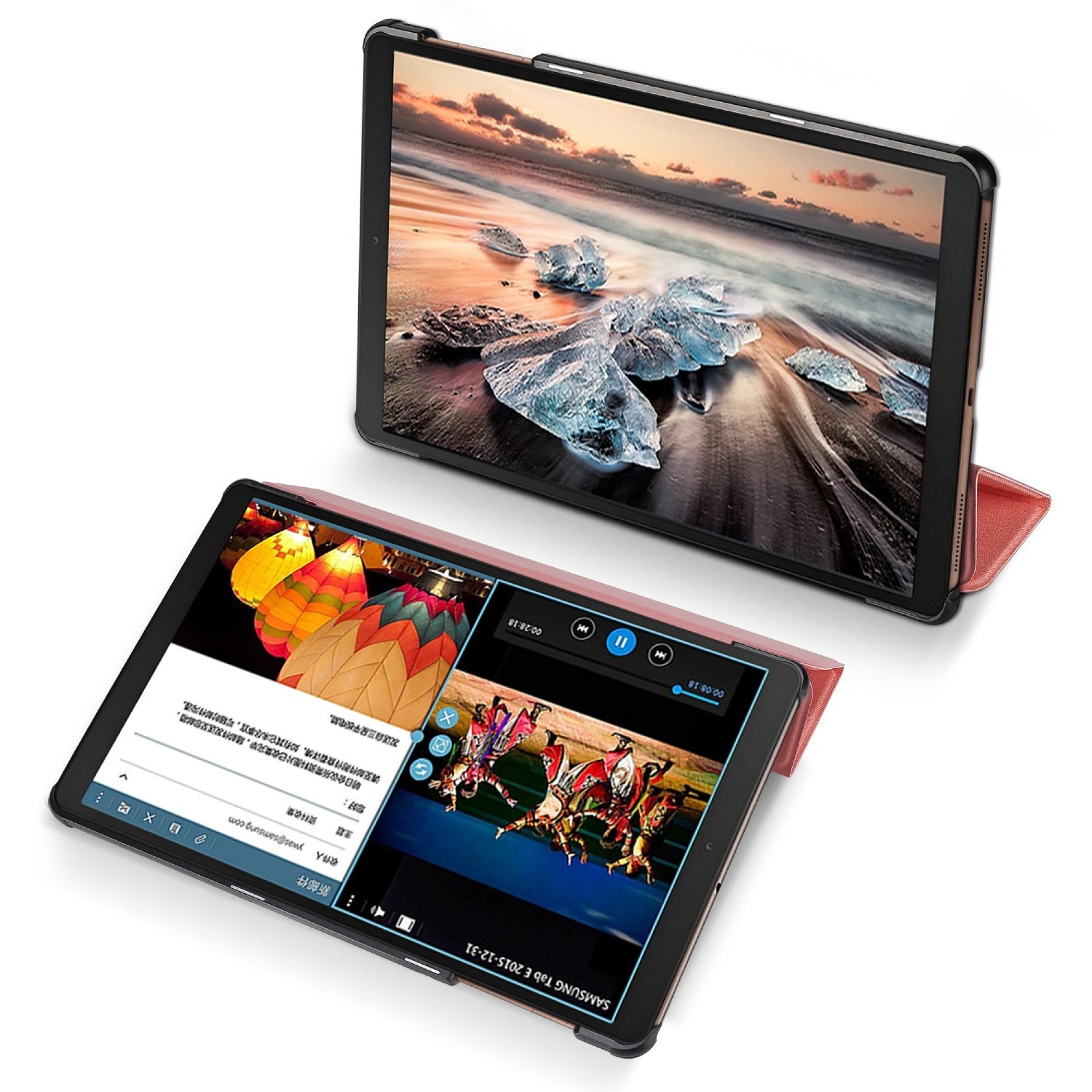 - Planšetės dėklas su stovo funkcija, galima pasirinkti dvi patogias planšetinio kompiuterio padėtis.